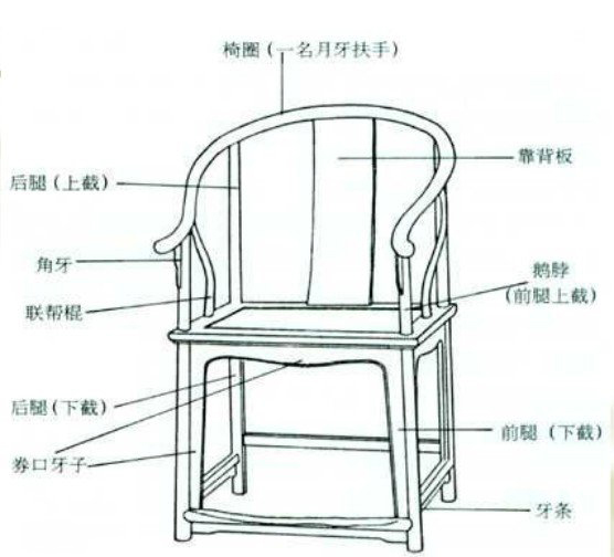 關(guān)于圈椅的結(jié)構(gòu)構(gòu)造,我們就用最經(jīng)典也是最原始的明式圈椅作為描述對(duì)象,它的每個(gè)結(jié)構(gòu)構(gòu)造以及命名術(shù)語(yǔ)包括: