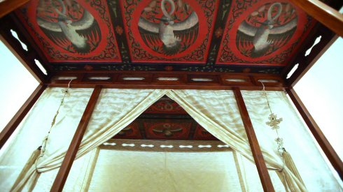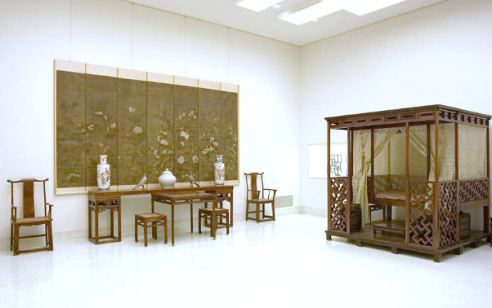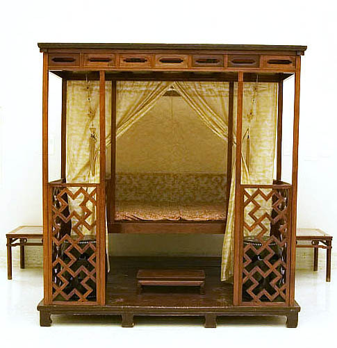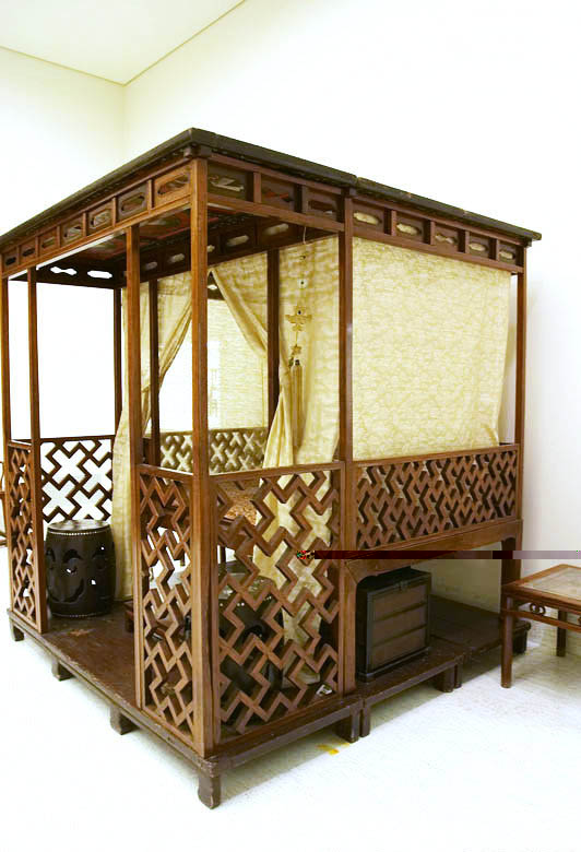 拔步床簡直就是個(gè)小房子,是建在木質(zhì)地坪上的房中房。床的四周掛上帷幔,是極為私密的空間。有些甚至幾重帷幔,連床前的門廊也遮掩起來,冬天是和暖的溫床,夏天驅(qū)避蚊蟲襲擾,在南方使用較多。