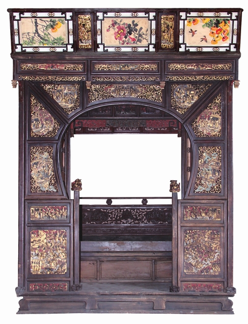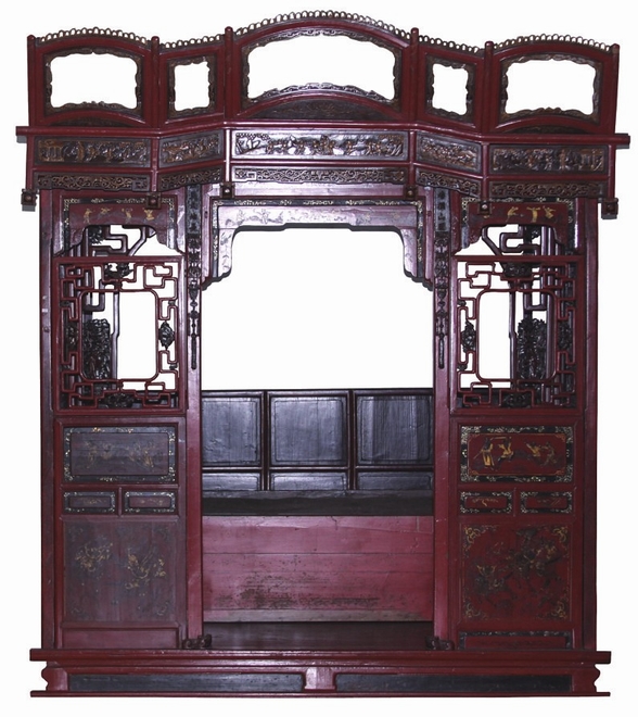 整張床高大寬闊,帶圍窗,踏步寬敞,豐富多彩的圖案運(yùn)用透雕、彩繪、貼金等多種手法,洋溢著喜慶吉祥的新婚氣息。