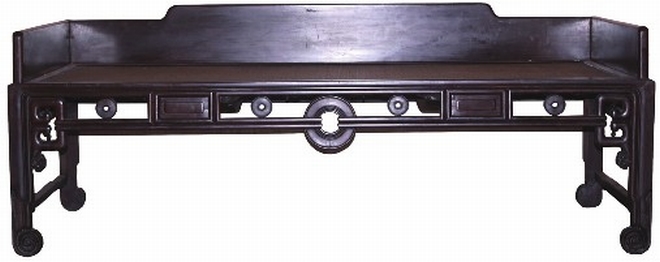 榻為紅木制,三塊光素的獨(dú)板做圍子,無(wú)束腰,攢框裝藤編軟屜為芯,直腿卷云紋。牙條正中為大銅錢紋飾,兩邊對(duì)稱嵌銅錢卡子花,榻兩側(cè)安羅鍋棖。
